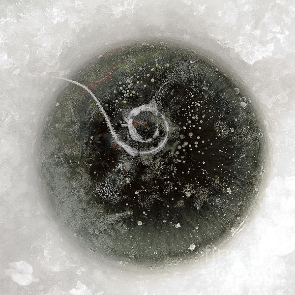 A frozen over ice fishing hole on Lake Wingra, Madison, WI. A swirl of fishing line and some leaves are frozen into the ice hole.