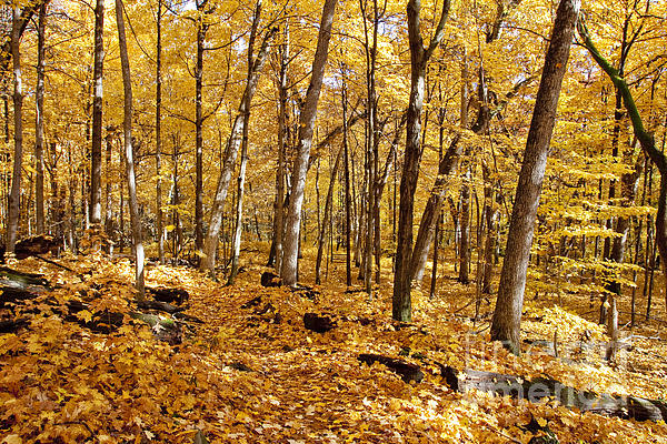 A yellow maple leaf covered trail leads to a bench which gives a welcome rest in this glorious fall image in the Arboretum in Madison, Wisconsin
