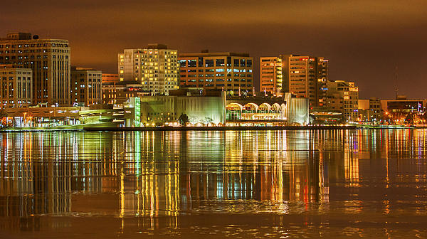 Monona Terrace at night, with all the lights reflecting off Lake Monana,in Madison, WI.