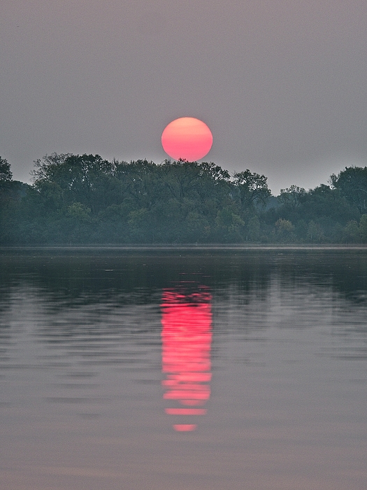 The Sun, as a bright orange disc, is visible through the thin clouds at sunrise on Lake Wingra in Madison, Wisconsin.